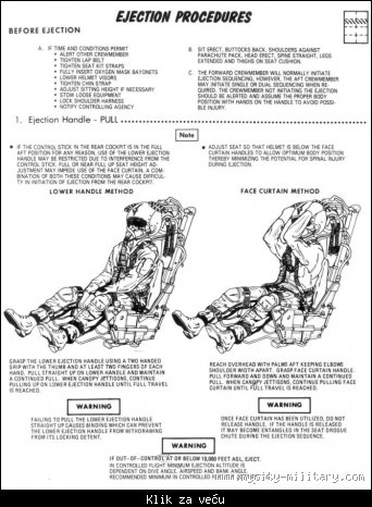 Pored onog sto je Mix nabrojao, znaci mehanicko odbacivanje poklopca kabine gdje u citavoj frci valja traziti rucicu za odbacivanje poklopca ili ici ravno sjedistem kroz poklopac, posebno na avionima na zapadu koliko sam vidio postavlja se i tanki explozivni naboj na poklopac kabine ( lici na grijace na zadnjoj sajbi na autu ) [Link mogu videti samo ulogovani korisnici] koji se u mili sek. aktivira prije nego li sjediste sa pilotom izleti iz kokpita, znaci cim pilot povuce rucicu na sjedistu, sve se automatski odvija...Naj interesantnije katapultiranje je rijeseno na F 111 gdje cijela kabina se katapultira umjesto piloti pojedinacno...